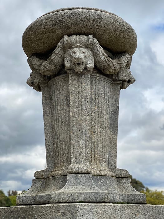 At the Shrine of Remembrance, I found eight mighty lions, each in pairs, at the corners of the stone monument. Each pair led by a young boy, pulling a chariot. Guardians of something precious, each chariot signified a virtue: