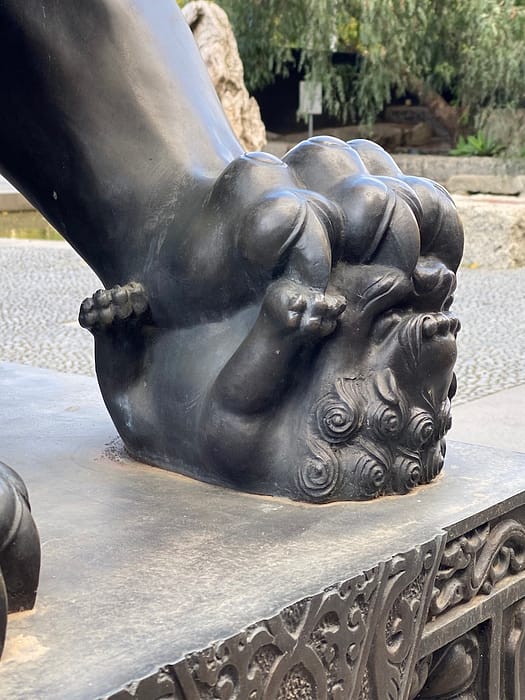 “We are not the Great Lion that you seek, though we are fierce and powerful. Our duty is to protect this sacred entrance and drive away all enemies and evil spirits. We are found in pairs. My female consort channeling ‘yin’, resting her great paw upon our playful cub. While I the male, channel ‘yang’, and toy with my ball of imperial influence. Go deeper into the city if you truly seek the King of this Jungle. He has a tail to share.”